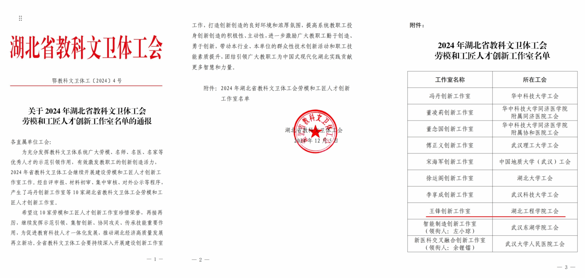 王锋创新工作室获批2024年湖北省教科文卫体工会劳模和工匠人才创新工作室
