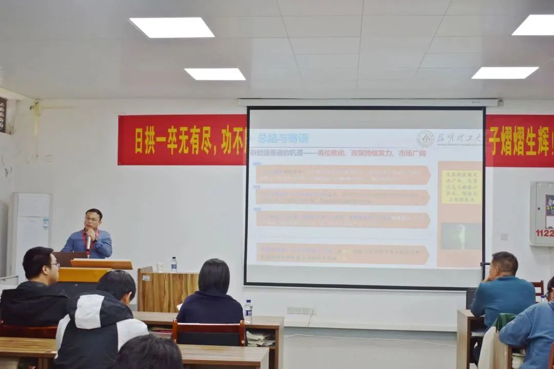 王贤树教授以“对新能源材料与器件的理解”为主题,与同学们一起研究和探讨,热火朝天。从“双碳”战略下能源结构转型路径、新能源技术应用概况、新能源电池产业概况三个方面娓娓道来,同学们都专心致志地听着,积极互动。