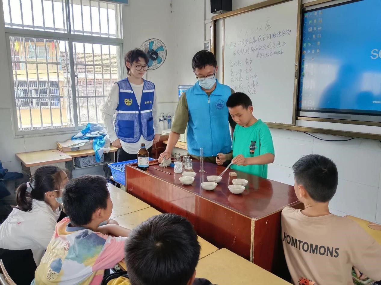 2023512日,太阳成集团tyc234cc主页​太阳成集团tyc234cc主页青年志愿者们,带着化学实验材料,来到湖北省孝感市桂桥小学,为小员工上了一堂生动的化学实验课。大朋友们快速和小朋友熟悉后,先后展示了焰色反应,对反应原理进行了讲解;展示了不同金属氯化物和乙醇合并燃烧能产生彩色焰火;带小朋友们亲手做酸碱滴定实验,观察液体颜色变化。小朋友们认真地观察,欢呼雀跃,目光炯炯有神,一举一动都流露出他们对奇妙化学世界的探索欲。