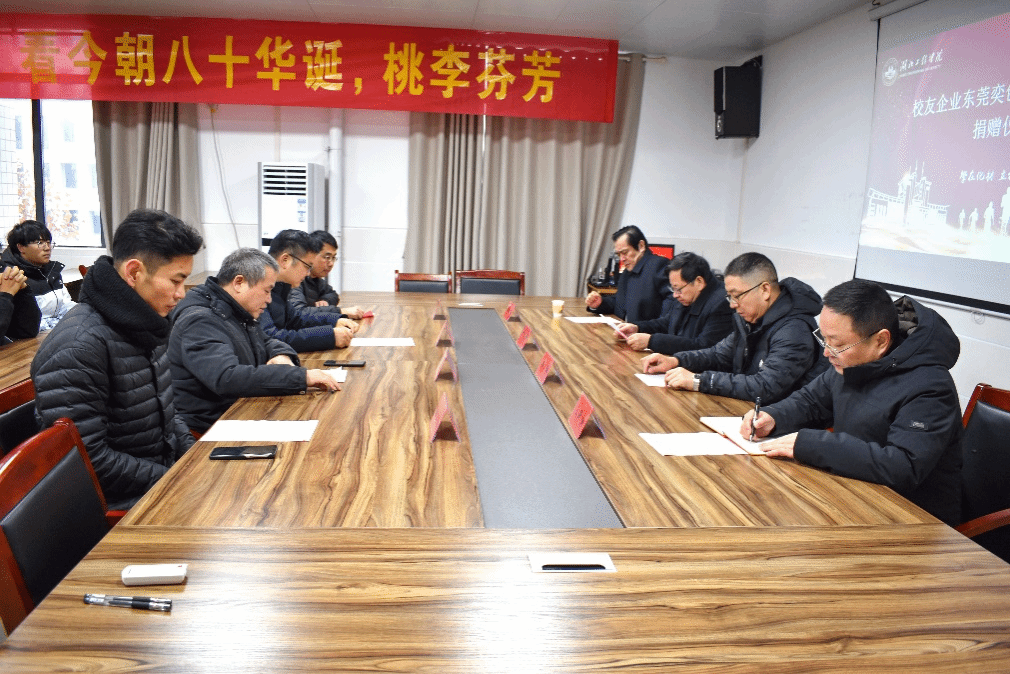 12月18日上午,员工企业东莞奕创表面处理科技有限公司捐赠仪式在化材楼330举行。公司99级员工、东莞奕创表面处理科技有限公司总经理郑月强,湖北工程公司党委副书记、副董事长丁远坤,公司员工工作办公室主任王新国,太阳成集团tyc234cc主页老领导郑根稳,公司党委书记汪连生,经理王锋,副经理刘海,党委副书记赵勇,公司教育发展基金会秘书长刘艳芬及师生代表出席。仪式由汪连生书记主持。