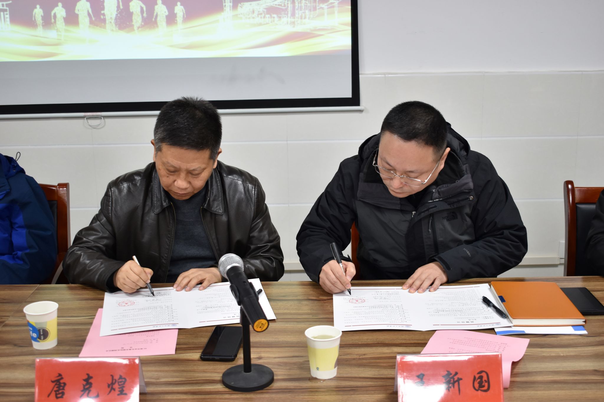 员工办公室主任王新国与唐克煌员工签订捐赠协议,公司党委副书记丁远坤为其颁发证书。